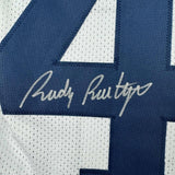 Autographed/Signed Rudy Ruettiger Notre Dame White College Jersey JSA COA Jersey has no brand names or logos. This is a custom jersey and was not manufactured by or in any manner associated with any professional sports league or manufacturer. This custom jersey carries no professional sports league designation. The item is intended to be an autographed collectible. The custom jersey displays the name and number of the player. This item in no way is affiliated with or connected to any professional sports organization. Size is XL.