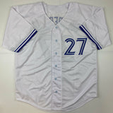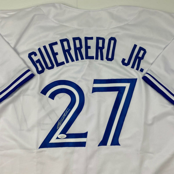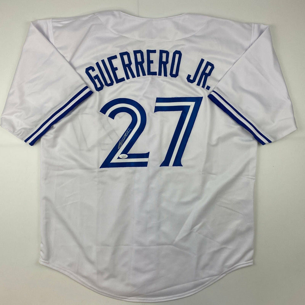 Autographed/Signed Vladimir Vlad Guerrero Jr. Toronto White Jersey JSA COA Jersey has no brand names or logos. This is a custom jersey and was not manufactured by or in any manner associated with any professional sports league or manufacturer. This custom jersey carries no professional sports league designation. The item is intended to be an autographed collectible. The custom jersey displays the name and number of the player. This item in no way is affiliated with or connected to any professional sports organization. Size is XL.