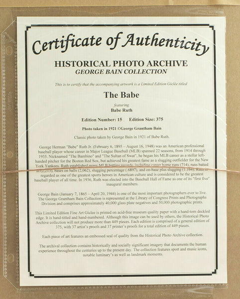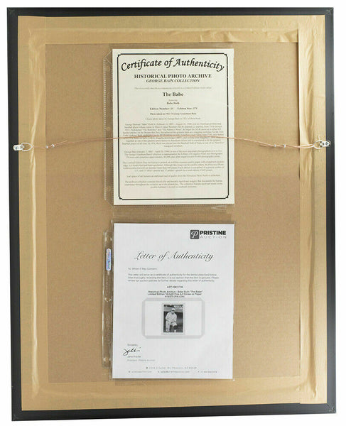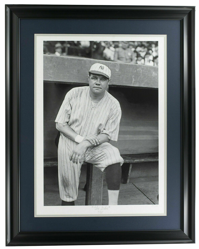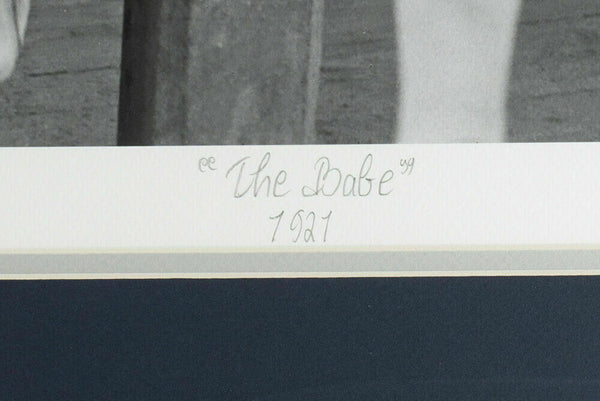 George Herman "Babe" Ruth Jr. was an American professional baseball player whose career in Major League Baseball spanned 22 seasons, from 1914 through 1935. Nicknamed "The Bambino" and "The Sultan of Swat," he began his MLB career as a stellar left handed pitcher for the Boston but achieved his greatest fame as a slugging outfielder for the New York Yankees. Ruth established many batting (and some pitching) records, including career home runs (714), runs batted in (RBI's) (2,213), bases on balls (2,062), slugging percentage (.6897), and on-base plus slugging (OPS) (1.164); the latter two still stand today. Ruth is regarded as one of the greatest sports heroes in American culture and is considered by many to be the greatest baseball player of all time. This Limited Edition Fine Art Giclee is printed on acid-free museum quality paper with a hand-torn deckled edge. It is hand-titled, hand-numbered. Edition size is limited to 375 pieces. Measures approximately 10" x 14.5" in size. This giclee has been professionally framed and matted and is approximately 17x22. This giclee comes with an official Historical Photo Archive letter.. SPECIFICATIONS Autographed By: Team: New York Yankees Sport: Baseball-MLB Authentication: James Spence Authentication (JSA)