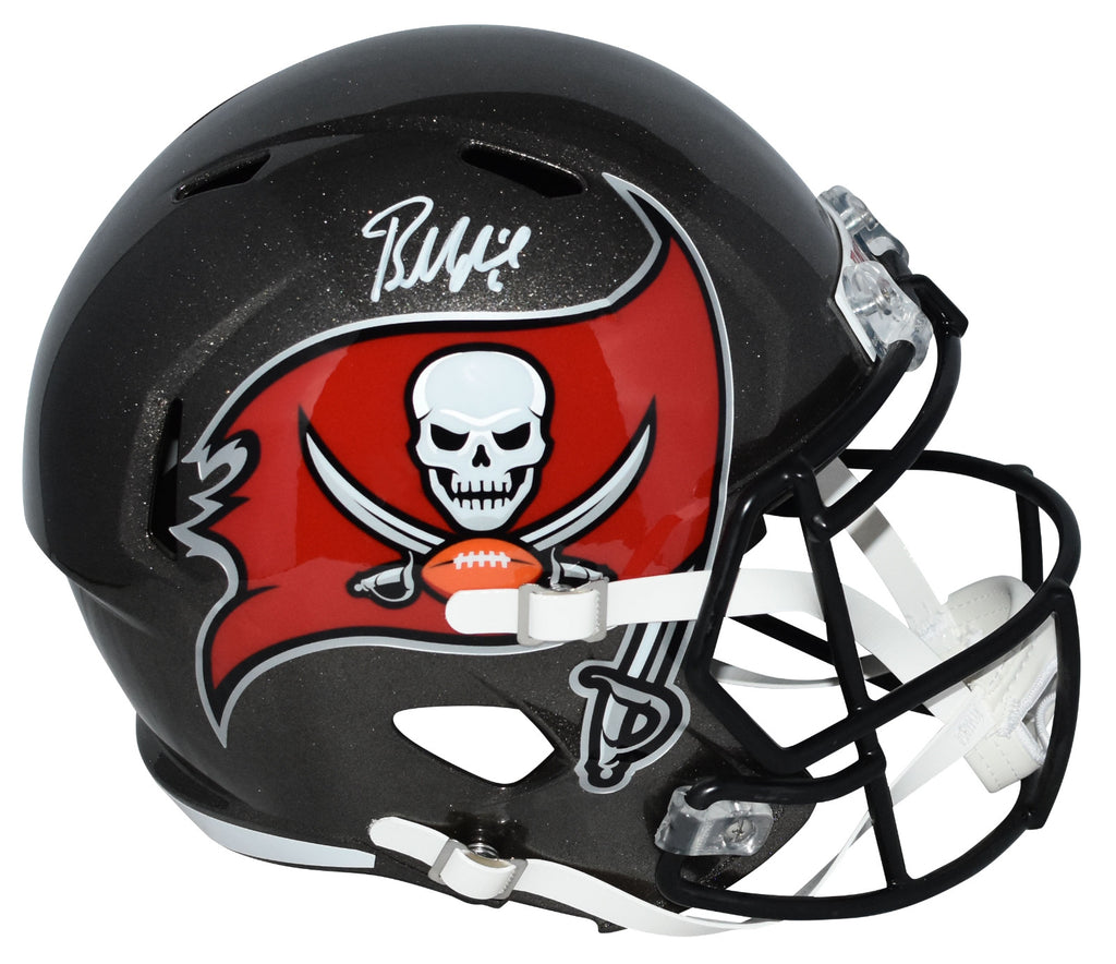 Baker Mayfield, star quarterback for the Tampa Bay Buccaneers, has hand signed this Bucs Riddell Speed full-size replica helmet at a private signing. This item is authenticated by Beckett Authentication Services and was signed in the presence of one of their representatives. Their tamper-evident hologram featuring a QR code and serial number is on the item. The authenticity can be verified online by entering the serial number or scanning the QR code.Item pictured may not be the exact item you will receive. It will be similar quality, and we guarantee your satisfaction.