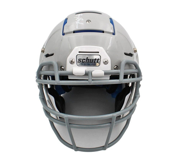 A Detroit Lions Schutt F7 Gray NFL Helmet hand signed by Barry Sanders. The item and signature are in excellent condition. Barry is a 10x Pro Bowler, 10x All-Pro, 4x Rushing Champion, and NFL MVP. AUTHENTICATION: The item is accompanied by a Schwartz Sports Certificate of Authenticity - Schwartz Sports Serial Numbered & Databased Hologram