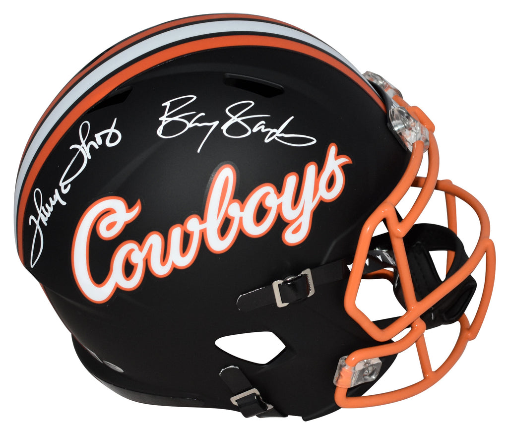 Barry Sanders and Thurman Thomas, former All-American running backs for the Cowboys, have each hand signed this Oklahoma State Riddell Speed full-size replica helmet at a private signing. This item is authenticated by Beckett Authentication Services and was signed in the presence of one of their representatives. Their tamper-evident hologram featuring a QR code and serial number is on the item. The authenticity can be verified online by entering the serial number or scanning the QR code.Item pictured may not be the exact item you will receive. It will be similar quality, and we guarantee your satisfaction.
