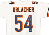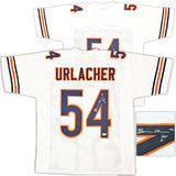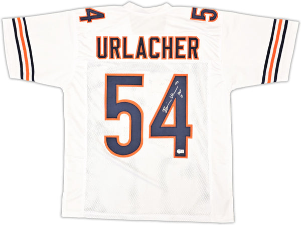 This is a White Jersey that has been hand signed by Brian Urlacher. This is a custom jersey with no name brand. The approximate size is XL. It has nice sewn in name and numbers. This item was inscribed "HOF 18." This item has been witnessed and certified authentic by Beckett Authentication (BAS) and comes with their tamper-proof witness sticker.