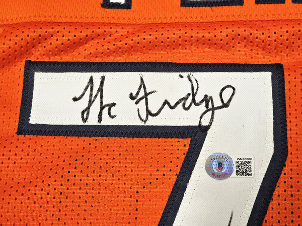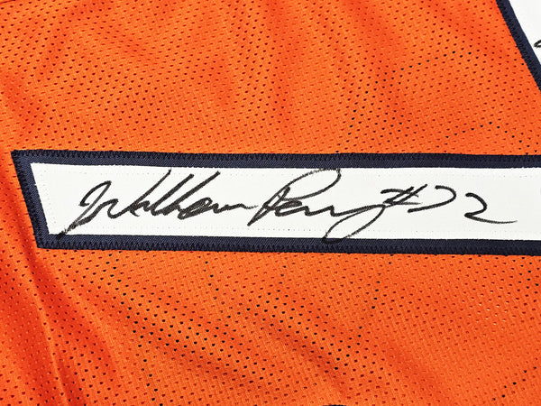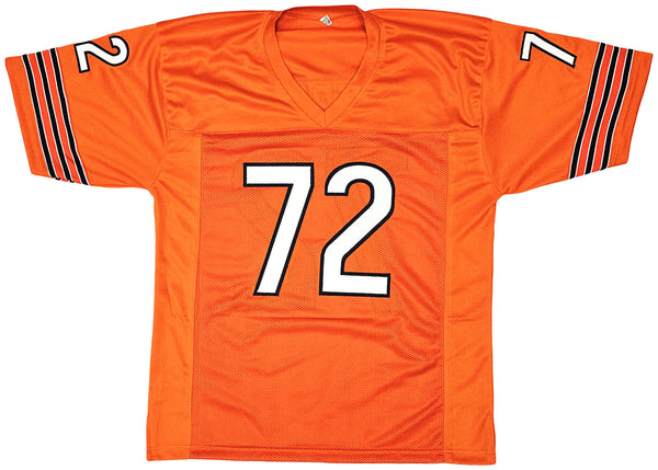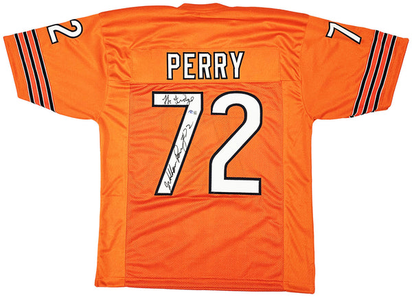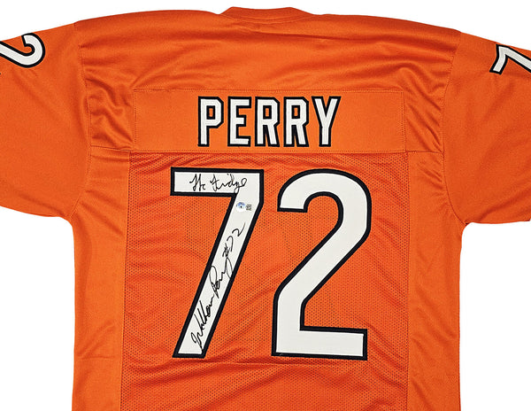 This is an Orange Jersey that has been hand signed by William Perry. This is a custom jersey with no name brand. The approximate size is XL. It has nice sewn in name and numbers. This item was inscribed "The Fridge." This item has been witnessed and certified authentic by Beckett Authentication (BAS) and comes with their tamper-proof witness sticker.
