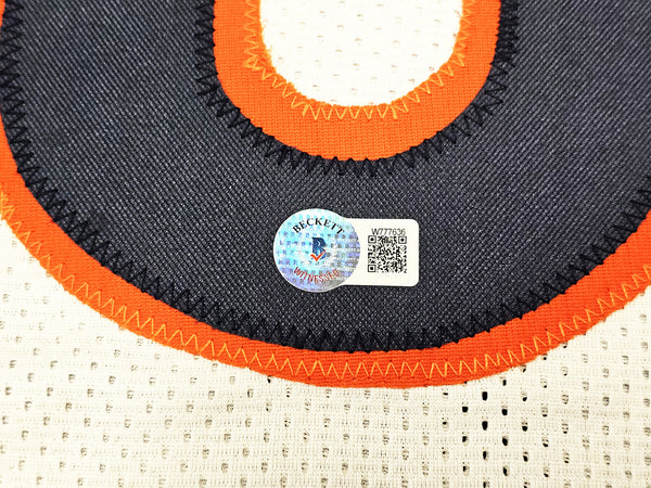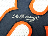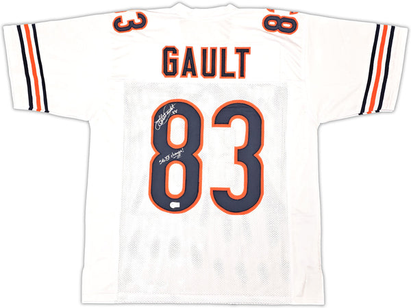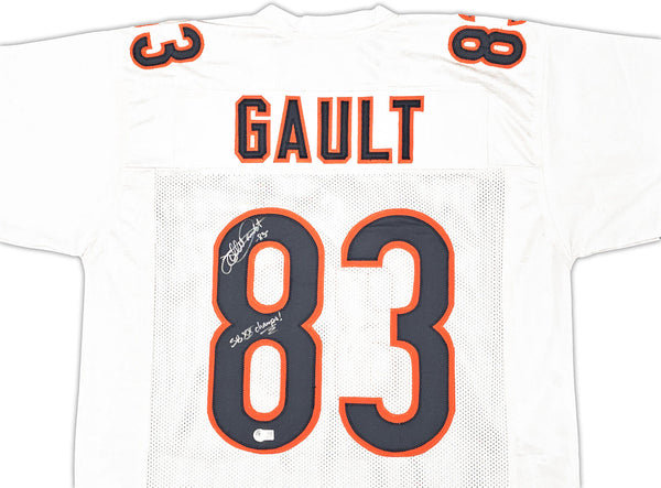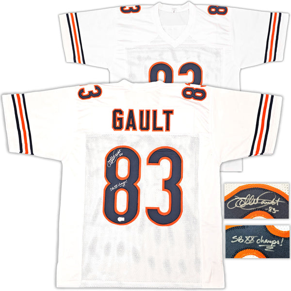 This is a White Jersey that has been hand signed by Willie Gault. This is a custom jersey with no name brand. The approximate size is XL. It has nice sewn in name and numbers. This item was inscribed "SB XX CHAMPS." This item has been witnessed and certified authentic by Beckett Authentication (BAS) and comes with their tamper-proof witness sticker.