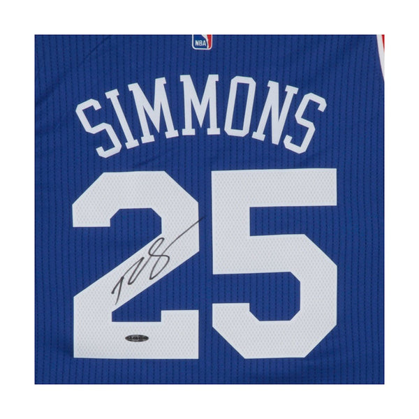 While an injury slowed Ben Simmons from making his regular season debut in Philadelphia, 76ers fans saw enough of him in the summer league to know he's a star in the making. His outside shot is quickly developing, and he's already one of the best ball handlers and passers around. Forwards who stand 6'10" aren't supposed to fire rocket passes to open teammates, but that's exactly what Simmons does on a nightly basis. He can rebound with anyone in the league and quickly lead the break after pulling said rebound down. His skillset is unique for a player of any size, let alone a player of his stature (240 pounds). Look for Sixers fans and NBA fans around the world to get excited anytime Simmons gets his hands on the ball. Simmons has signed this 76ers away blue jersey in black paint pen. His signature is deemed authentic by virtue of Upper Deck Authenticated's Five-Step Process.