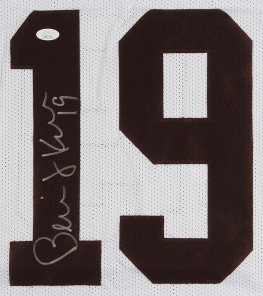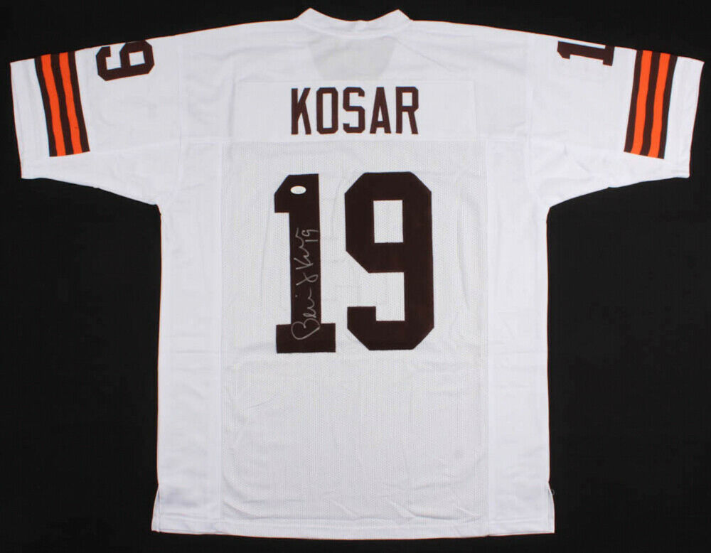 Custom on-field style jersey. Everything is sewn on, size XL. Has been hand-signed by Bernie Kosar.The lot / autograph(s) includes an official James Spence Authentication (JSA) hologram and matching COA for authenticity purposes. The signing of this item was witnessed by JSA.Authentication: JSA COA