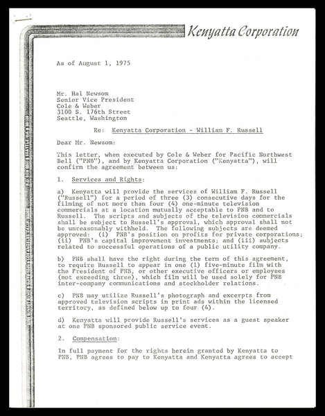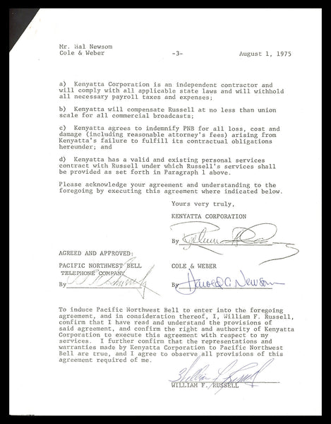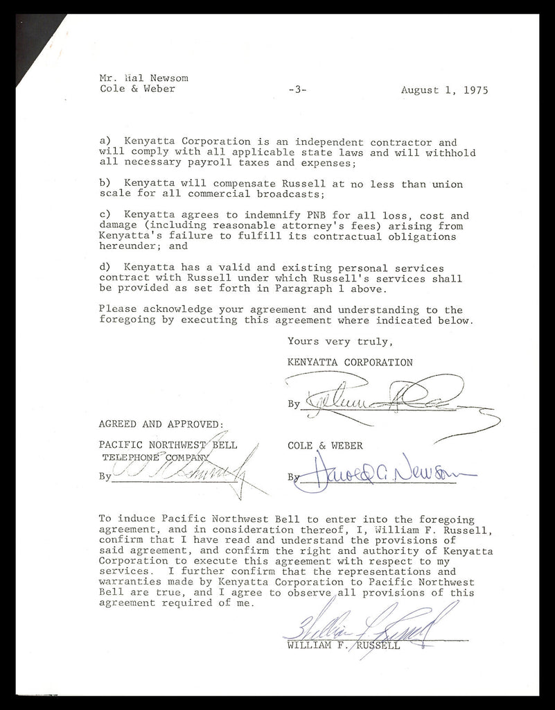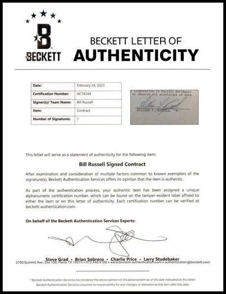 This is a 1975 TV Contract, approximately 8.5x11, that has been hand signed by Bill Russell. This item has been certified authentic by Beckett Authentication (BAS) and comes with their tamper-proof sticker and matching full-page certificate of authenticity.