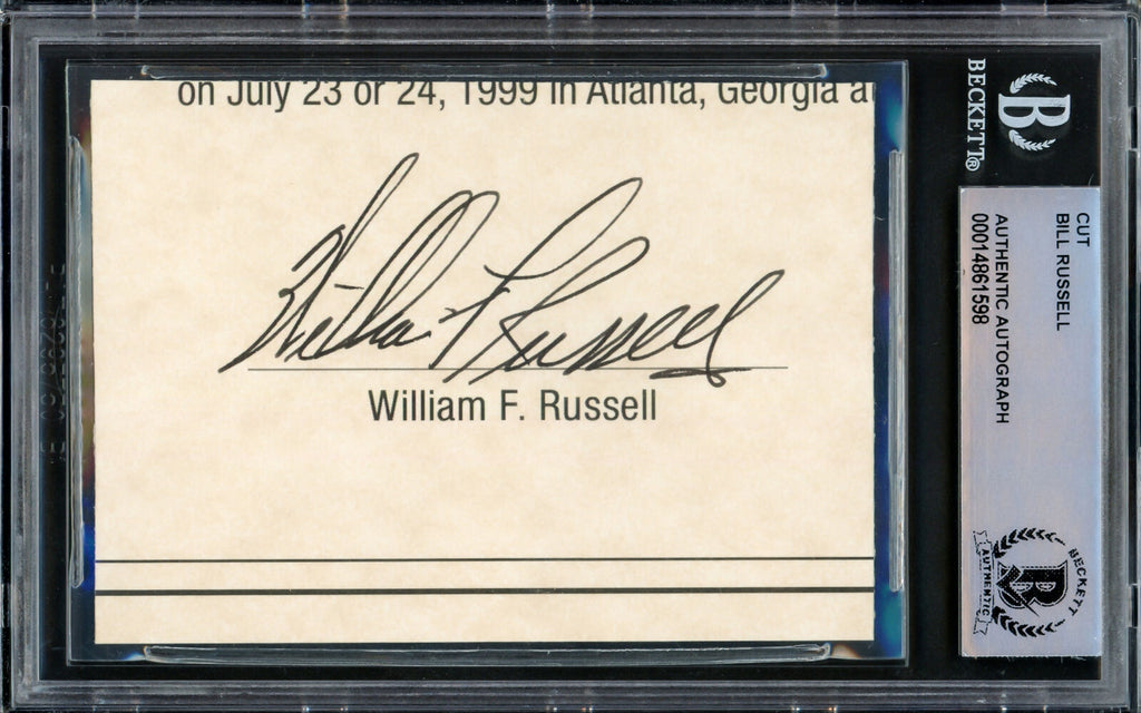 This is a 2.5x3.5 Cut Signature that has been hand signed by Bill Russell. Russell signed this item with his full name. It has been certified authentic by Beckett Authentication Services (BAS) and comes encapsulated in their tamper-proof holder.