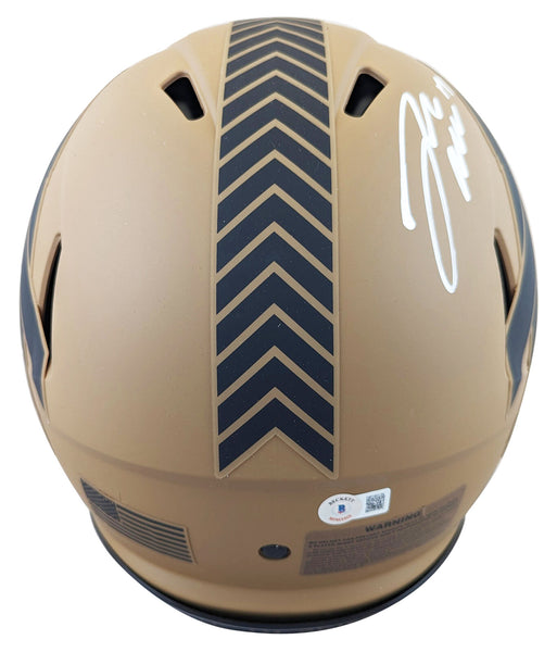 This Autographed Alternate 2023 Salute To Service II Riddell Authentic Full Size Speed Proline Helmet has been Personally Signed by Jim Kelly & Josh Allen of the Buffalo Bills. This item is 100% Authentic to include a hologram by Beckett Authentication Services. This item will come with an affixed Beckett Authentication Services (BAS) authentication sticker, which includes a scannable QR code to verify authenticity. Please note that Beckett no longer provides serial-numbered COA cards, and the attached BAS sticker will serve as the complete authentication for this item. This is a BAS Witnessed Protection Program item which means a Beckett Authentication Service representative was present when this item was being signed. We conducted an autograph signing with Jim Kelly & Josh Allen where multiples of the same item were signed. While the photographs are representative of this item, the size, placement and strength of the signature may vary. Each item is hand signed, therefore, each autograph is unique. This item can be verified through BAS Witnessed.