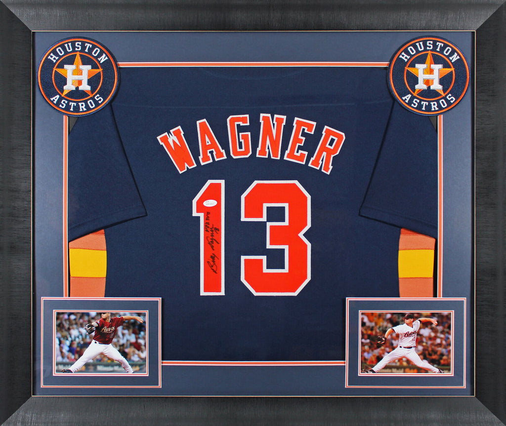 This Autographed Navy Blue Pro Style Framed Jersey with the inscription of "422 Svs" has been Personally Signed by Billy Wagner of the Houston Astros. This item is 100% Authentic to include a Certificate of Authenticity (COA) / hologram by JSA Witness. This is a JSA Witnessed Protection Program item which means a JSA representative was present when this item was being signed. We have multiples of this same item. While the photographs are representative of this item, the size, placement and strength of the signature may vary. Each item is hand signed, therefore, each autograph is unique. This item has been professionally framed to overall dimensions of approximately 32 x 37 inches. This is a X-Large sized, non-branded, custom-stitched Framed Jersey. This jersey will be framed to order, it will take 3-4 days from purchase date for it to ship.