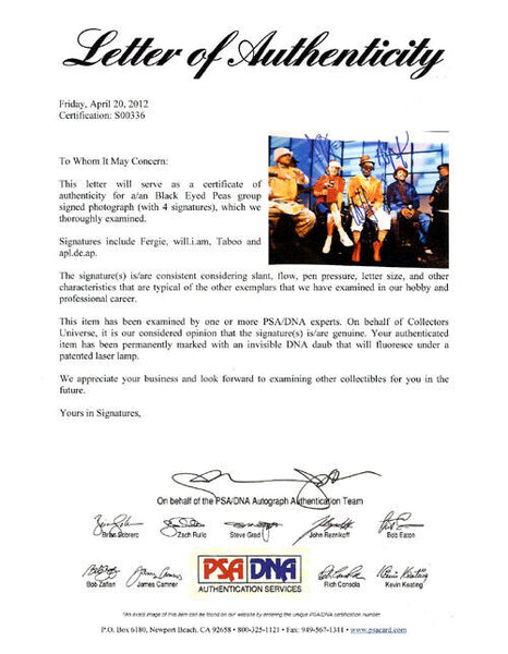 This is an 8x10 Photo That has been hand signed by Black Eyed Peas. It has been certified authentic by PSA/DNA and comes with their sticker and matching full page certificate of authenticity.