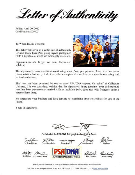 This is an 8x10 Photo That has been hand signed by Black Eyed Peas. It has been certified authentic by PSA/DNA and comes with their sticker and matching full page certificate of authenticity.