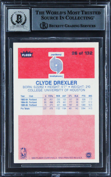 Blazers Clyde Drexler Signed 1986 Fleer #26 Rookie Card Auto 10! BAS Slabbed