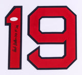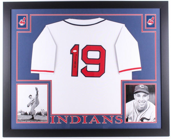 Custom frame measures approximately 35" x 43" in size and features a jersey which has been hand-signed in black felt tip pen by Bob Feller (D 2010, HOF). The autograph includes an official James Spence Authentication (JSA) hologram and matching COA for authenticity purposes.Authentication: JSA COA