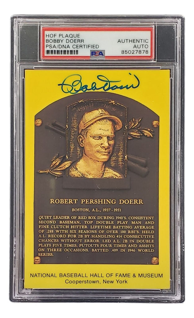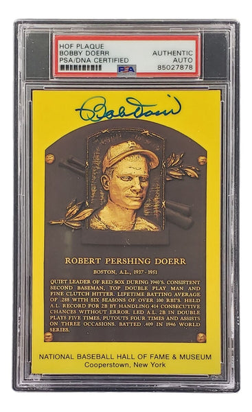 Featured is a Bobby Doerr (Boston Red Sox) signed 4x6 Hall Of Fame plaque card. This card has been hand signed by Doerr and has been authenticated and encapsulated by PSA/DNA. This card would make a great addition to any sports memorabilia collection!. SPECIFICATIONS Autographed By: Bobby Doerr Team: Boston Red Sox Sport: Baseball Authentication: Professional Sports Authenticator (PSA)