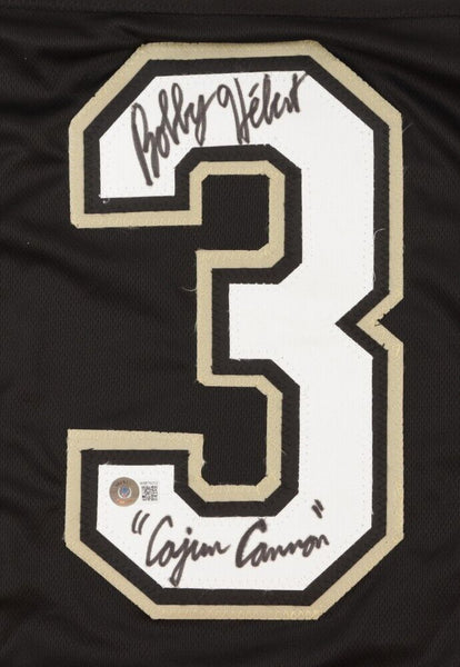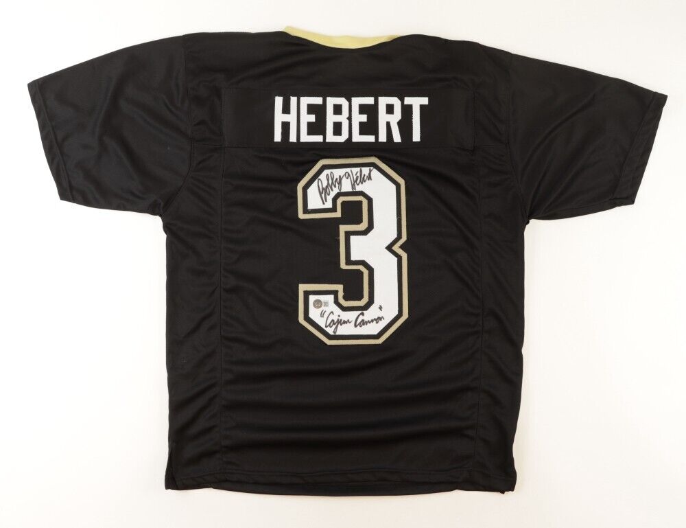 Custom on-field style jersey. Everything is sewn on, size XL. Has been hand-signed and inscribed by Bobby Hebert.The autograph includes an official Beckett Authentication Services serially numbered hologram for authenticity purposes. The signing of this item was witnessed by Beckett.Authentication: Beckett Hologram