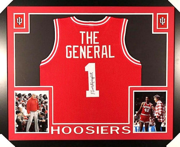 Custom frame measures approximately 35" x 43" in size and features a jersey which has been hand-signed in black felt tip pen by Bobby Knight (HOF). The autograph includes an official James Spence Authentication (JSA) hologram and matching COA for authenticity purposes. The signing of this item was witnessed by JSA.Authentication: JSA COA