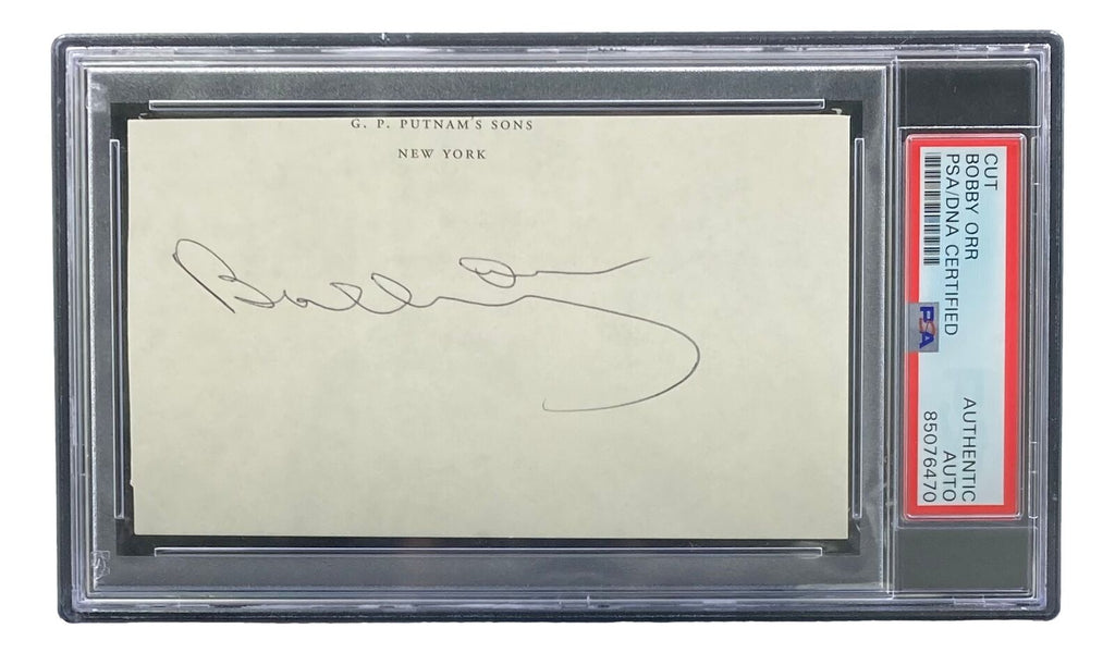Featured is a Bobby Orr Boston Bruins signed book cut signature. This cut has been hand signed by Orr and has been authenticated and encapsulated by PSA/DNA. This cut would make a great addition to any sports memorabilia collection!. SPECIFICATIONS Autographed By: Bobby Orr Team: Boston Bruins Sport: Hockey Authentication: Professional Sports Authenticator (PSA)
