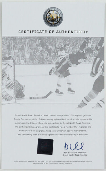 Boston Bruins official NHL logo hockey puck is hand-signed by Bobby Orr (HOF).The autograph includes an official Bobby Orr hologram and matching COA from Great North Road for authenticity purposes.Authentication: Bobby Orr COA