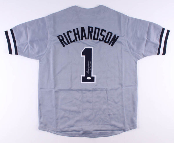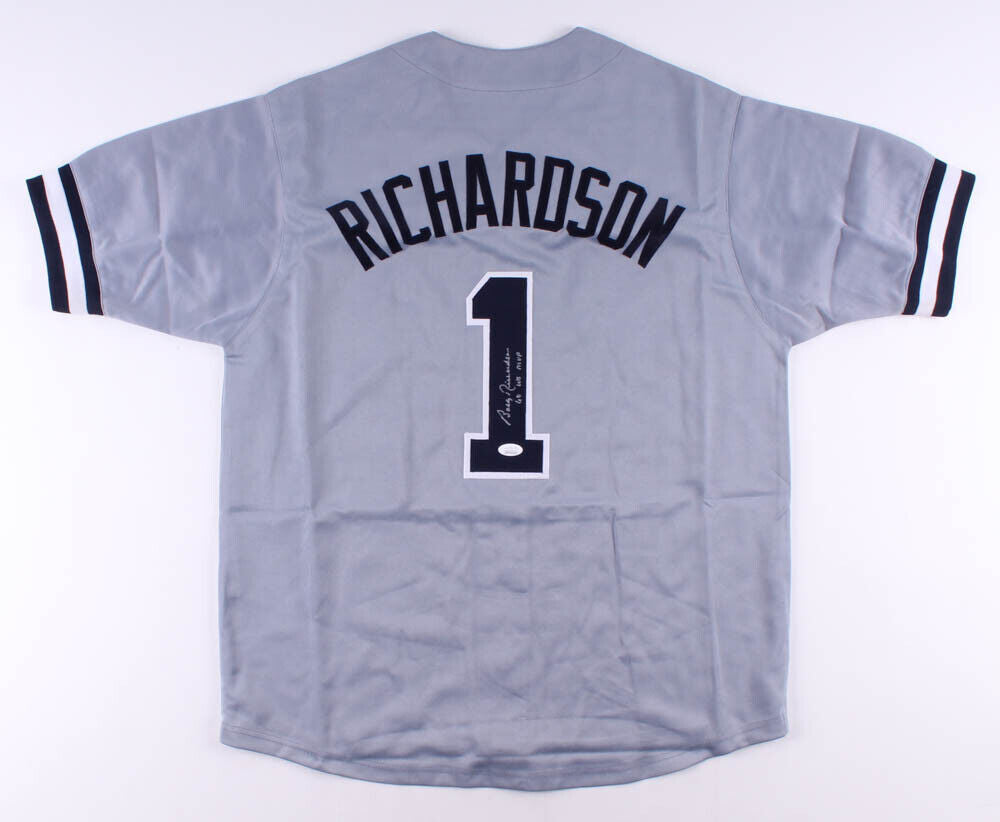 Custom on-field style jersey. Everything is sewn on, size XL. Hand-signed in black felt-tip pen by Bobby Richardson. The lot / autograph(s) includes an official James Spence Authentication (JSA) hologram and matching COA for authenticity purposes. The signing of this item was witnessed by JSA.Authentication: JSA COA