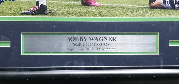 This is a Framed 12x18 Photo, approximately 21x26 with the frame, that has been hand signed by Bobby Wagner. This item was inscribed "Go Hawks!." This item was signed in the presence of a Mill Creek Sports representative and comes with their serial numbered hologram and matching certificate of authenticity.
