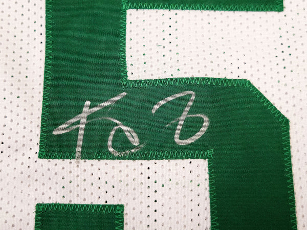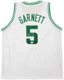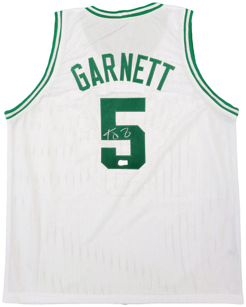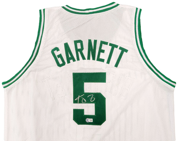 This is a White Jersey that has been hand signed by Kevin Garnett. This is a custom jersey with no name brand. The approximate size is XL. It has nice sewn in name and numbers. This item has been certified authentic by Beckett Authentication (BAS) and comes with their tamper-proof QR Code sticker that can be verified on the Beckett-authentication.com.