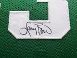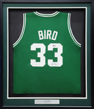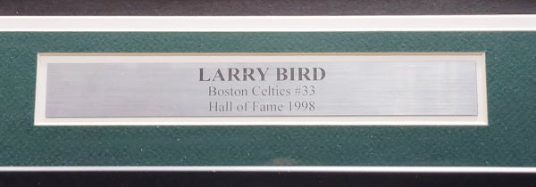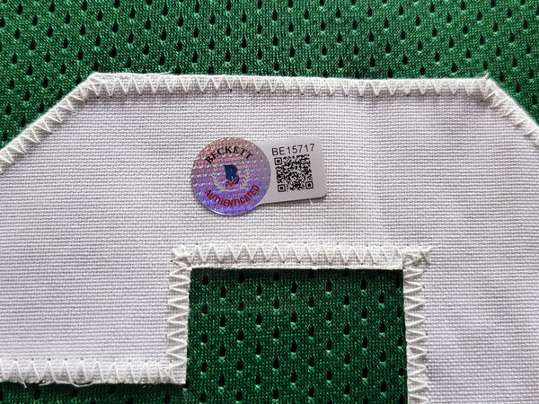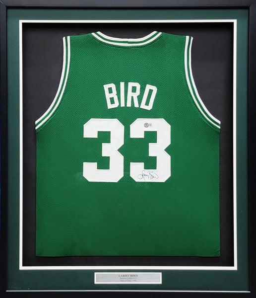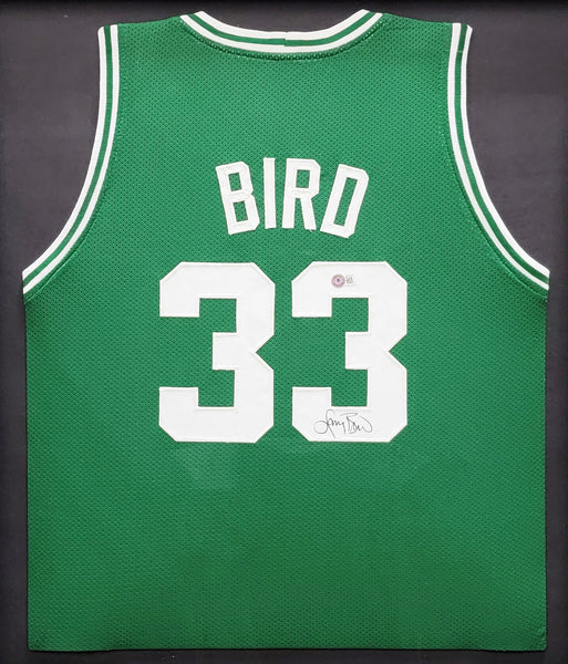 This is a framed Green Jersey, approximately 31x36 with the frame, that has been hand signed by Larry Bird. This is a custom jersey with no name brand. The approximate size is XL. It has nice sewn in name and numbers. This item has been certified authentic by Beckett Authentication (BAS) and comes with their tamper-proof sticker. Beckett Authentication has recently changed their physical certificate card policy where they no longer match their tamper-proof sticker with a physical certificate. If the item features a Beckett Authenticated QR Code, the item does NOT come with a matching certificate. A certificate can be printed on Beckett's website for the matching authentication number.