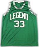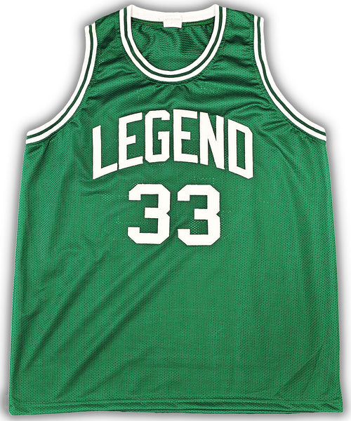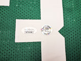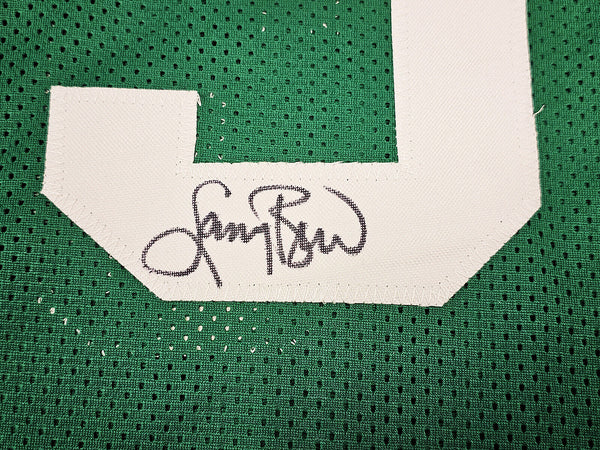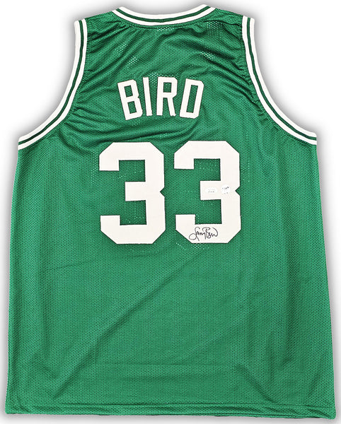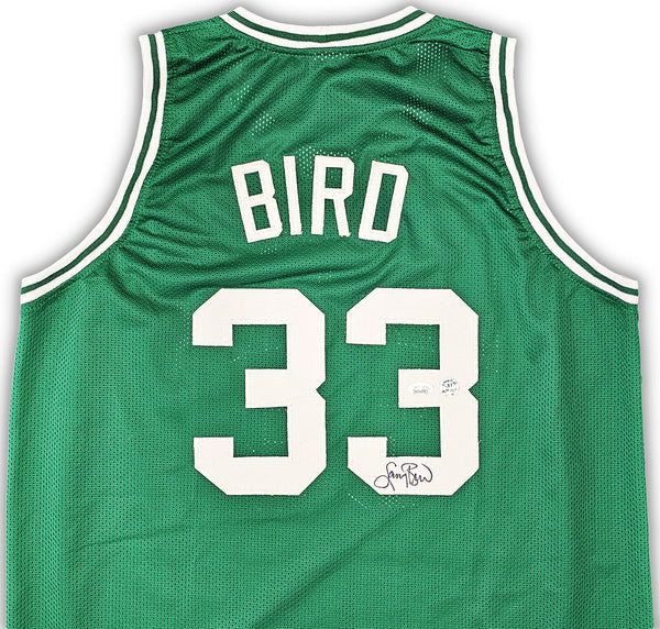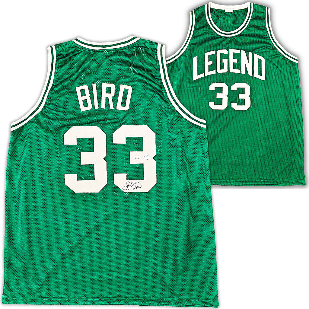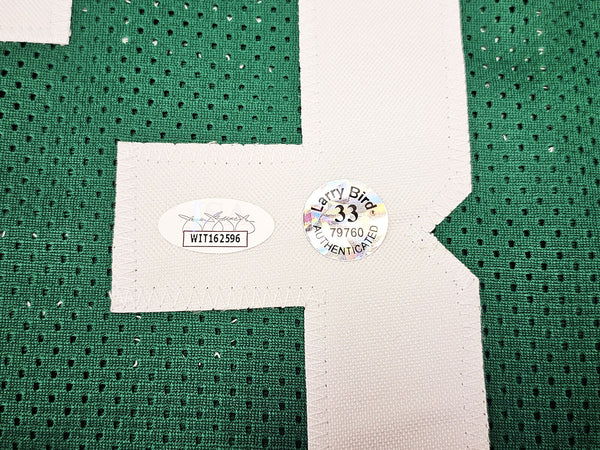 This is a Green Jersey that has been hand signed by Larry Bird. This is a custom jersey with no name brand. The approximate size is XL. It has nice sewn in name and numbers. This item has been certified authentic by JSA and comes with their tamper-proof sticker and matching certificate of authenticity.