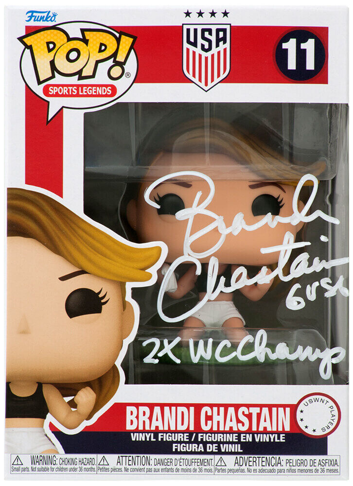 Brandi Chastain signed USA Women's Soccer Funko Pop doll #11 with '2x WC Champs' inscription. Item comes with a Schwartz Sports Memorabilia tamper-proof numbered hologram and Certificate of Authenticity which can be verified online.