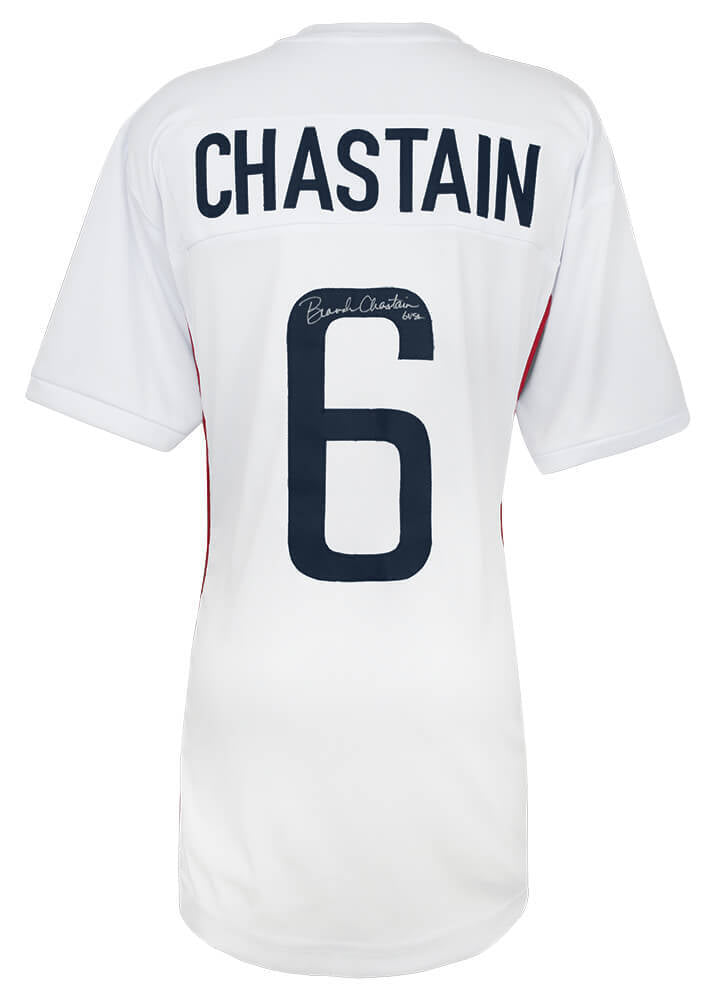 Brandi Chastain signed white custom soccer jersey. Item comes with a Schwartz Sports Memorabilia tamper-proof numbered hologram and Certificate of Authenticity which can be verified online. Jersey is size XL.