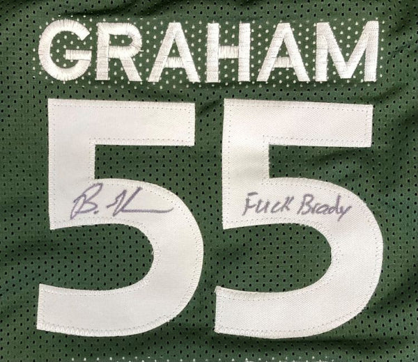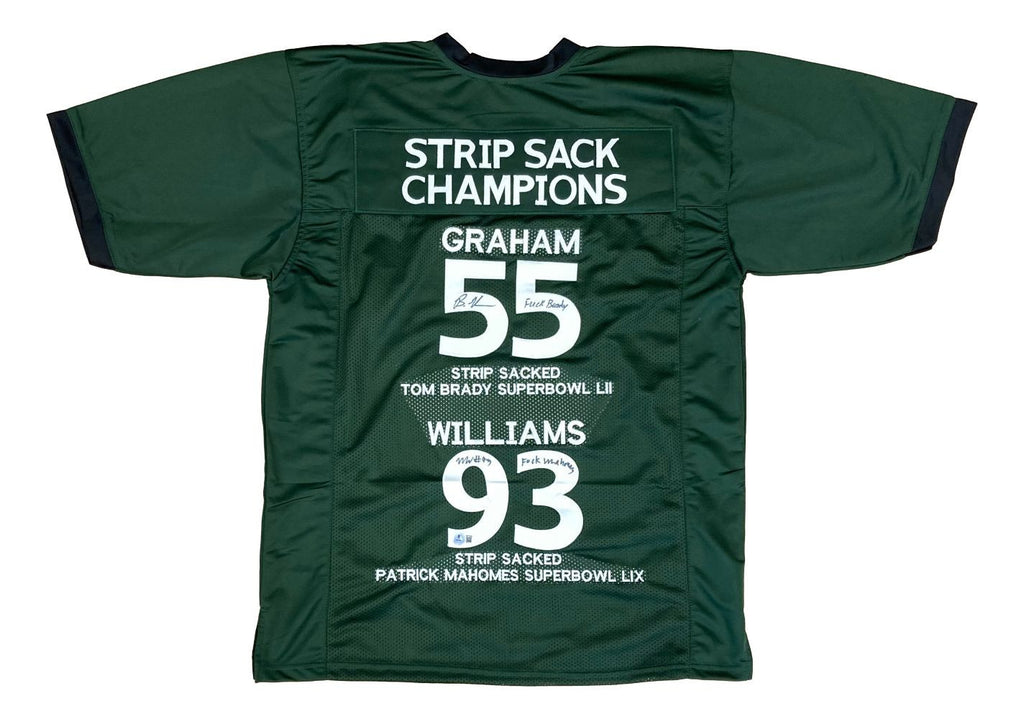 Featured is a Brandon Graham and Milton Williams signed custom football jersey, inscribed "F*** Brady" (Graham) and "F*** Mahomes" (Williams). This jersey has been hand signed by Graham and Williams and comes with the Beckett hologram and certificate of authenticity. This jersey features professionally sewn letters and numbers and is size XL. This jersey has no team tags or emblems and is intended as a sports collectible. This jersey would make a great addition to any sports memorabilia collection!. SPECIFICATIONS Autographed By: Brandon Graham Team: Philadelphia Eagles Sport: Football Authentication: Beckett Grading Services
