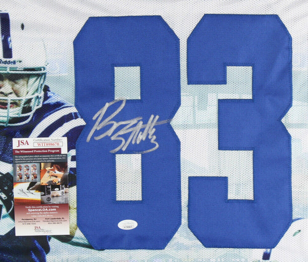 Custom on-field style jersey. Everything is sewn on, size XL. Hand-signed by Brandon Stokley.Please note, there appears to be light discoloration near the front-side of the collar and on the left sleeve. See photos to confirm the jersey's condition.The lot / autograph(s) includes an official James Spence Authentication (JSA) hologram and matching COA for authenticity purposes. The signing of this item was witnessed by JSA.Authentication: JSA COA