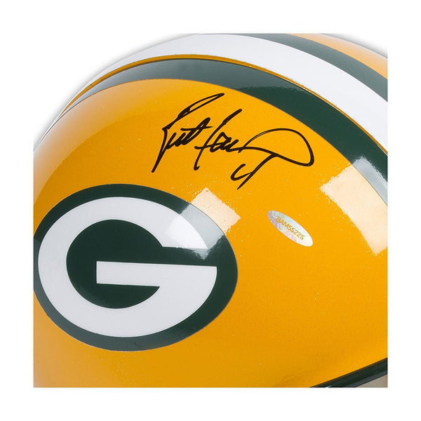 Brett Favre played four years at the University of Southern Mississippi before being selected in the second round of the 1991 NFL Draft by the Atlanta Falcons. Favre was eventually traded to the Green Bay Packers in 1992 and went on to bring home the Lombardi Trophy. Favre played 16 seasons in the Green Bay Packers uniform, and he started every game from 1992 to 2008. He helped the Packers appear in two Super Bowls, and they were victorious in Super Bowl XXXI. His professional career turned out to be one for the ages. Upper Deck Authenticated has had Brett Favre sign this authentic Riddell Green Bay Packers Helmet in black paint pen. Favre's black signature has been authenticated by virtue of Upper Deck Authenticated's Five-Step Authentication Process.
