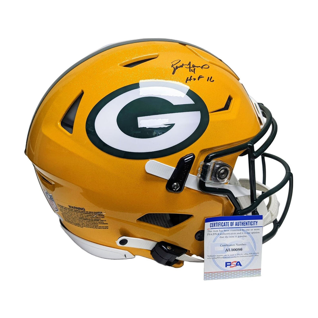 This RiddellA Green Bay Packers Flex Speed Full Size Authentic Pro Line Football Helmet has been hand signed by Brett Favre.A Mr. Favre added the HOF (Hall of Fame) 16 inscription. The Helmet will include the PSA/DNA Authentication sticker affixed to the helmet and a Certificate of Authenticity from PSA/DNA Authentication.