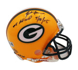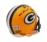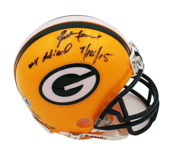 A Green Bay Packers NFL Mini Helmet hand signed by Brett Favre. The item and signature are in excellent condition. This is a Limited Edition of 44. Buyer will receive #44 from the edition. In addition to signing his name, Brett also inscribed "#4 Retired 7/18/15" on the item. Brett is a Super Bowl Champion, 11x Pro Bowler, and is a member of the NFL Hall of Fame. AUTHENTICATION: The item is accompanied by a /SQOR Sports Certificate of Authenticity - /SQOR Sports Serial Numbered and Databased Hologram - Picture of Brett from the signing.