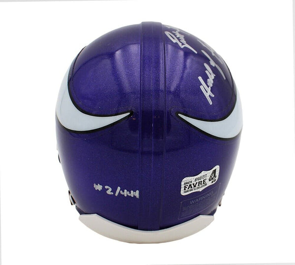 A Minnesota Vikings NFL Mini Helmet hand signed by Brett Favre. The item and signature are in excellent condition. In addition to signing his name, Brett also inscribed "Hall of Fame 2016" on the item. The item is a limited edition of 444. Buyer will receive a random number from the edition. Brett is a Super Bowl Champion, 11x Pro Bowler, and is a member of the NFL Hall of Fame. AUTHENTICATION: The item is accompanied by a /SQOR Sports Certificate of Authenticity - /SQOR Sports Serial Numbered and Databased Hologram - Picture of Brett from the signing.