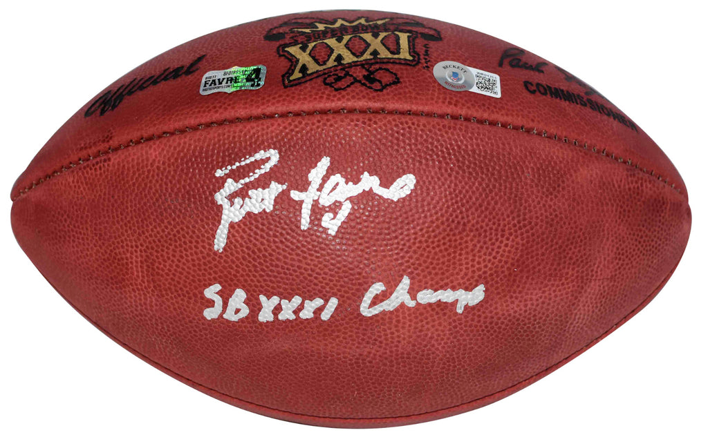 Brett Favre, former Hall of Fame quarterback for the Green Bay Packers, has hand signed this official Wilson Super Bowl XXXI game football at a private signing. He included the inscription "SB XXXI Champs" with his signature. This item is authenticated by Beckett Authentication Services and was signed in the presence of one of their representatives. Their tamper-evident hologram featuring a QR code and serial number is on the item. The authenticity can be verified online by entering the serial number or scanning the QR code.Item pictured may not be the exact item you will receive. It will be similar quality, and we guarantee your satisfaction.