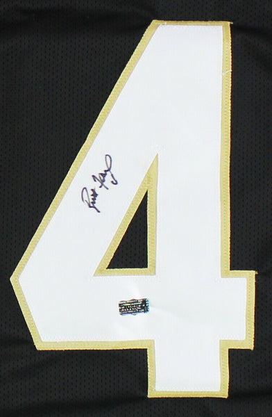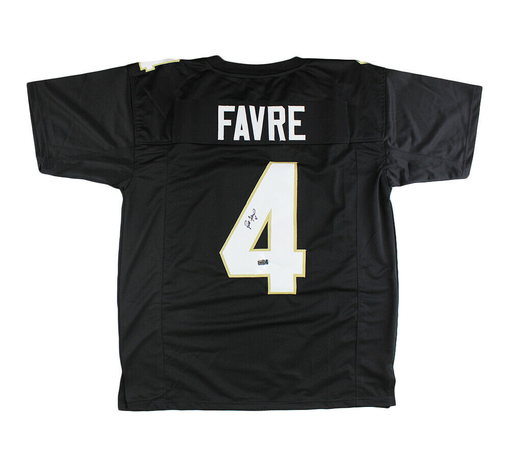 A University of Southern Mississippi Custom Black Jersey hand signed by Brett Favre. The item and signature are in excellent condition. Brett is a 20 year veteran of the NFL, Super Bowl Champion, 11x Pro Bowler, 3x AP NFL Most Valuable Player, 4x NFL passing touchdowns leader, and 2x passing yards leader. His number, 4, has been retired by both the Green Bay Packers and the Southern Miss Golden Eagles. Brett was inducted into the Pro Football Hall of Fame in 2016. AUTHENTICATION: Your item has been tagged with a Brett Favre Exclusive SmarTag powered by Prova Technology, which gives you digital access to your items authentication records, including a proof picture from the signing.