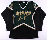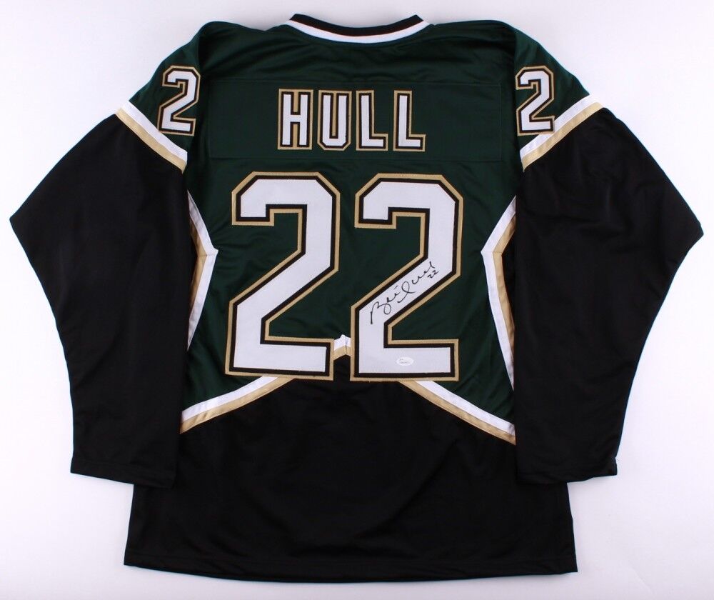 Custom on-ice style jersey. Everything is sewn on, size XL. Hand-signed in black felt-tip pen by Brett Hull (HOF). During his initial season in Dallas, his traditional jersey number, 16, was being worn by Stars forward Pat Verbeek, so Hull wore number 22 for that season, switching back to 16 in the 1999 offseason after Verbeek left the team. The lot / autograph(s) includes an official James Spence Authentication (JSA) hologram and matching COA for authenticity purposes. The signing of this item was witnessed by JSA.Authentication: JSA COA