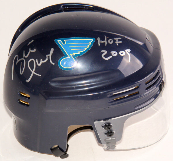 St. Louis Blues mini-helmet. Hand-signed in silver paint pen by Brett Hull (HOF). The lot / autograph(s) includes an official James Spence Authentication (JSA) hologram and matching COA for authenticity purposes. The signing of this item was witnessed by JSA.Authentication: JSA COA