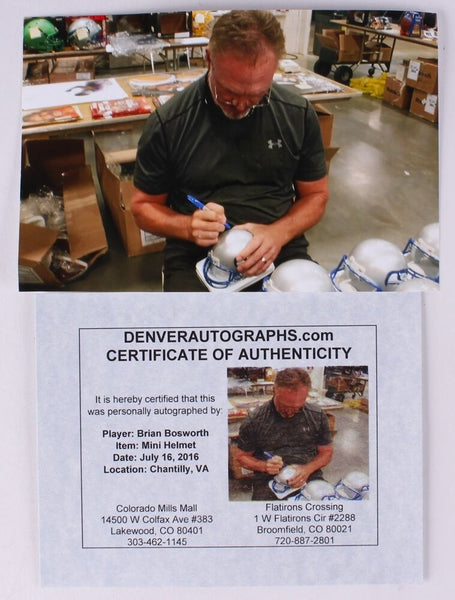 Riddell mini-helmet has been hand-signed in blue felt-tip pen by Brian Bosworth. The autograph includes an official James Spence Authentication (JSA) hologram and matching COA, as well as an official Denver Autographs COA for authenticity purposes. The signing of this item was witnessed by JSA. Authentication: JSA COA & Denver Autographs COA