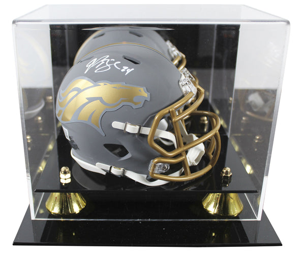 This Autographed Alternate Slate Speed Mini Helmet W/ Uv Mirrored Back Acrylic Display Case has been Personally Signed by Champ Bailey of the Denver Broncos. This item is 100% Authentic to include a hologram by Beckett Authentication Services. This item will come with an affixed Beckett Authentication Services (BAS) authentication sticker, which includes a scannable QR code to verify authenticity. Please note that Beckett no longer provides serial-numbered COA cards, and the attached BAS sticker will serve as the complete authentication for this item. This is a BAS Witnessed Protection Program item which means a Beckett Authentication Service representative was present when this item was being signed. We conducted an autograph signing with Champ Bailey where multiples of the same item were signed. While the photographs are representative of this item, the size, placement and strength of the signature may vary. Each item is hand signed, therefore, each autograph is unique. This item can be verified through BAS Witnessed.