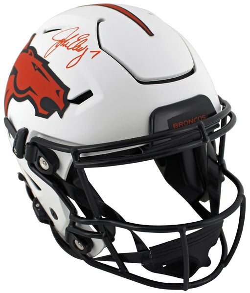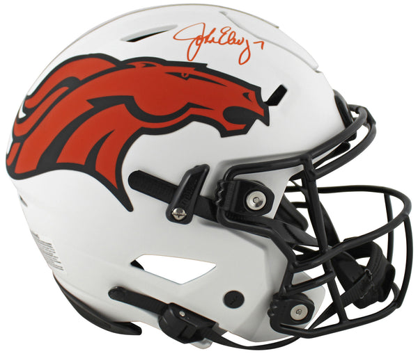 This Autographed Alternate Lunar Authentic Riddell Speed Flex Full Size Helmet has been Personally Signed by John Elway of the Denver Broncos. This item is 100% Authentic to include a hologram by Beckett Authentication Services. This item will come with the new Beckett Authentication hologram that has a scannable QR code rather than the traditional COA. If you would like to have a COA, you are welcome to reach out to Beckett for a printed certification once you receive your item. This is a BAS Witnessed Protection Program item which means a Beckett Authentication Service representative was present when this item was being signed. The authenticity can be verified on Beckett Authentication Services website.