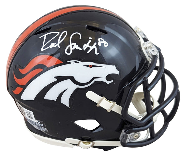 This Autographed Speed Mini Helmet has been Personally Signed by Rod Smith of the Denver Broncos. This item is 100% Authentic to include a hologram by Beckett Authentication Services. This item may come with the new Beckett Authentication hologram that has a scannable QR code rather than the traditional COA. If you would like to have a COA, you are welcome to reach out to Beckett for a printed certification once you receive your item. This is a BAS Witnessed Protection Program item which means a Beckett Authentication Service representative was present when this item was being signed. We conducted an autograph signing with Rod Smith where multiples of the same item were signed. While the photographs are representative of this item, the size, placement and strength of the signature may vary. Each item is hand signed, therefore, each autograph is unique. This item can be verified through BAS Witnessed.