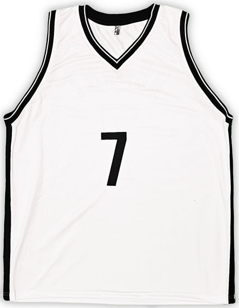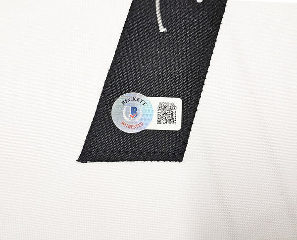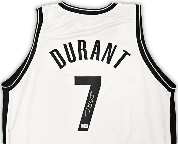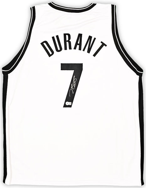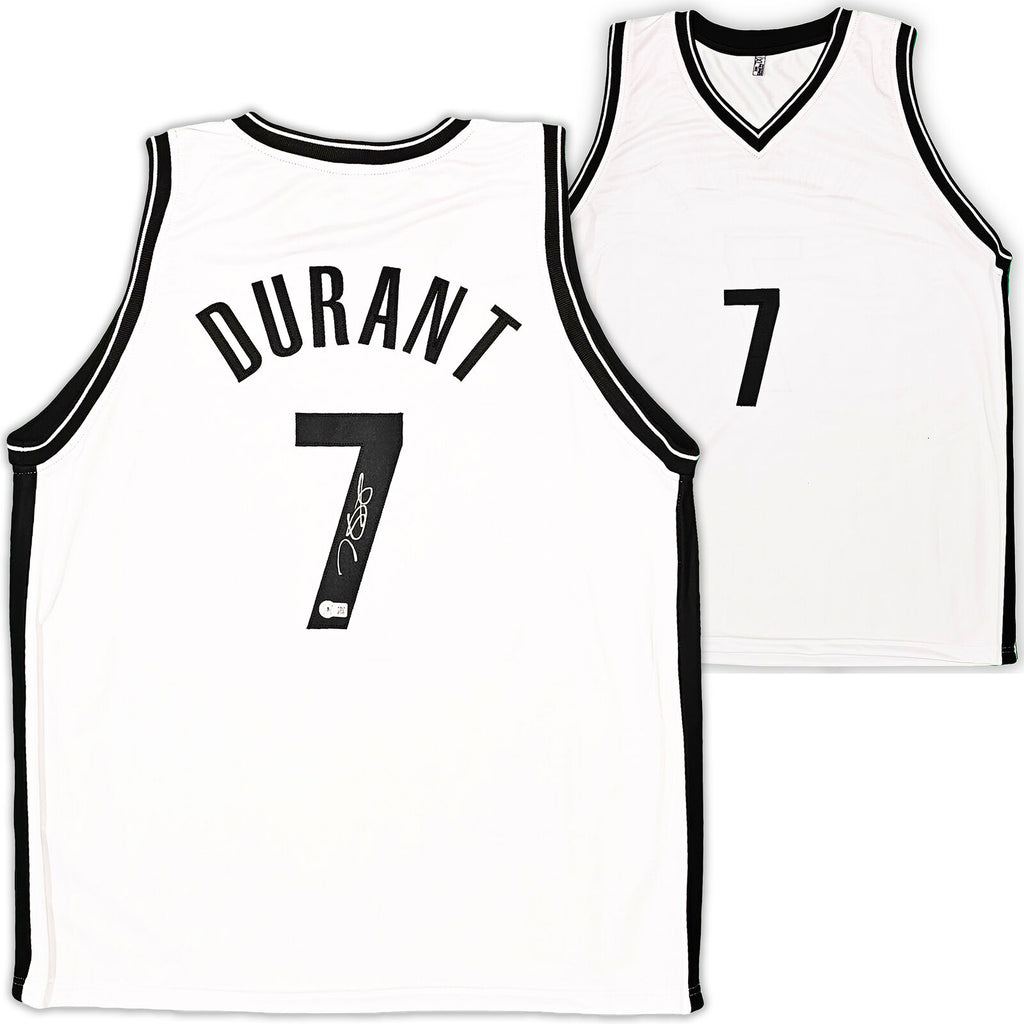 This is a White Jersey that has been hand signed by Kevin Durant. This is a custom jersey with no name brand. The approximate size is XL. It has nice sewn in name and numbers. This item has been witnessed and certified authentic by Beckett Authentication (BAS) and comes with their tamper-proof witness sticker. Beckett Authentication has recently changed their physical certificate card policy where they no longer match their tamper-proof sticker with a physical certificate. A certificate can be printed on Beckett's website for the matching authentication number.