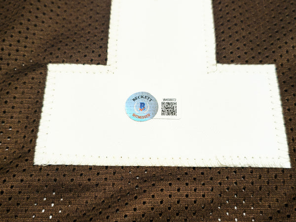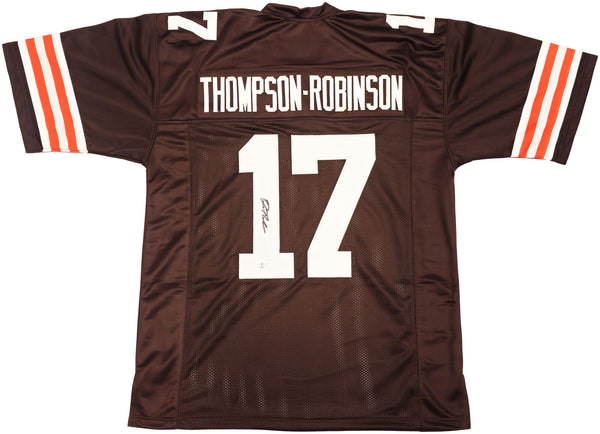 This is a Brown Jersey that has been hand signed by Dorian Thompson-Robinson. This is a custom jersey with no name brand. The approximate size is XL. It has nice sewn in name and numbers. This item has been witnessed and certified authentic by Beckett Authentication (BAS) and comes with their tamper-proof witness sticker.