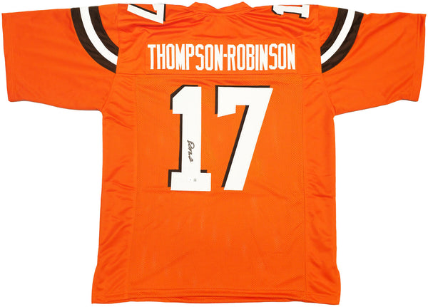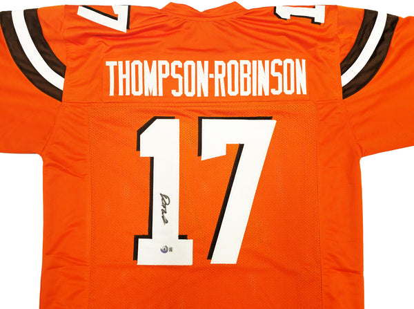 This is an Orange Jersey that has been hand signed by Dorian Thompson-Robinson. This is a custom jersey with no name brand. The approximate size is XL. It has nice sewn in name and numbers. This item has been witnessed and certified authentic by Beckett Authentication (BAS) and comes with their tamper-proof witness sticker.