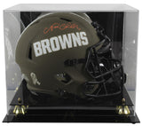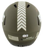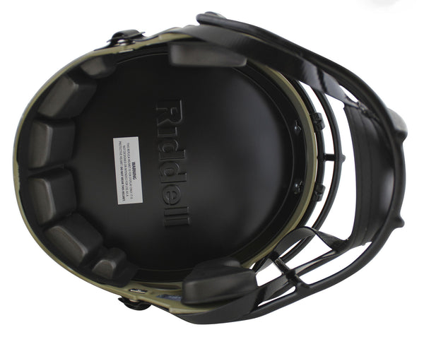 This Autographed Alternate Salute To Service Riddell Full Size Speed Rep Helmet W/ Uv Mirrored Back Acrylic Display Case has been Personally Signed by Nick Chubb of the Cleveland Browns. This item is 100% Authentic to include a hologram by Beckett Authentication Services. This item may come with the new Beckett Authentication hologram that has a scannable QR code rather than the traditional COA. If you would like to have a COA, you are welcome to reach out to Beckett for a printed certification once you receive your item. This is a BAS Witnessed Protection Program item which means a Beckett Authentication Service representative was present when this item was being signed. We conducted an autograph signing with Nick Chubb where multiples of the same item were signed. While the photographs are representative of this item, the size, placement and strength of the signature may vary. Each item is hand signed, therefore, each autograph is unique. This item can be verified through BAS Witnessed.