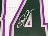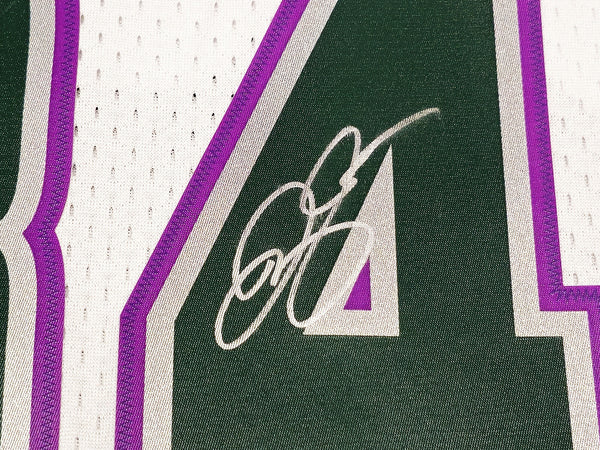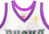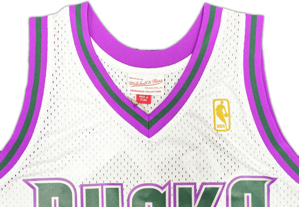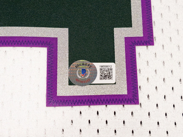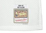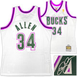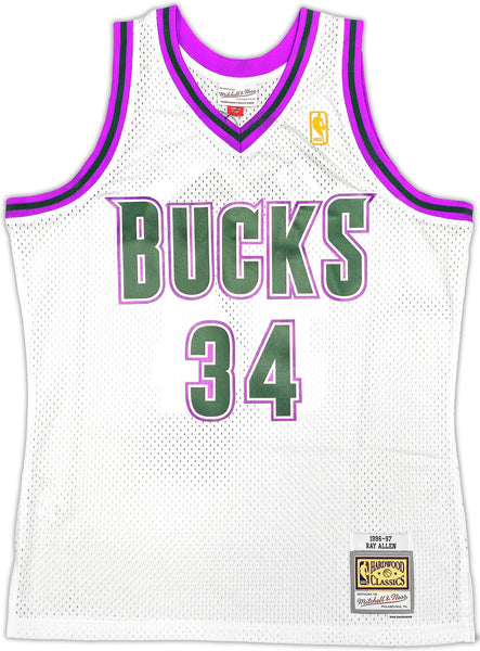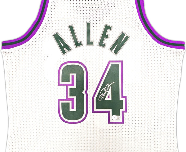 This is a White Authentic Mitchell & Ness Milwaukee Bucks 1996-97 Ray Allen HWC Swingman Jersey that has been hand signed by Ray Allen. This jersey is Size L. This item has been witnessed and certified authentic by Beckett Authentication (BAS) and comes with their tamper-proof witness sticker.